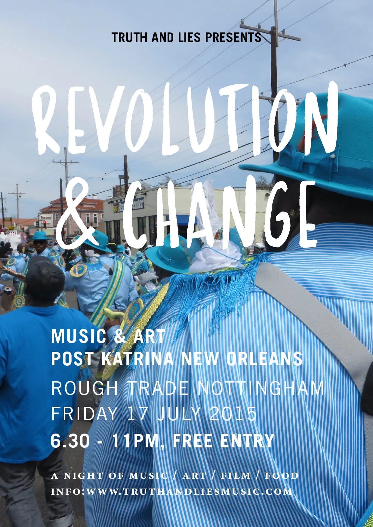 On August 29 2005, New Orleans was hit by one of the worst hurricanes in American history. 80% of New Orleans was flooded with some areas up to 4.8 metres underwater. Over half a million people were evacuated. One of the first truly multicultural cities in the USA and the birthplace of Jazz was devastated. Revolution and Change presents a snapshot of the music and art before and after this event and provides inspiration for change on a local and national level.